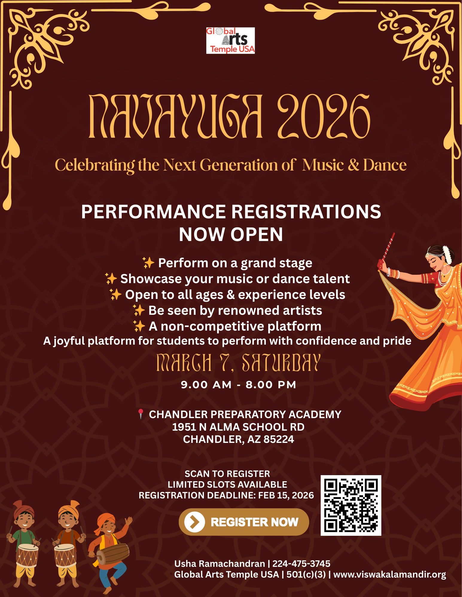 Multi-genre music and dance performances by local leading schools, Arizona talents and aspiring artists. A grand vocal concert by the Carnatica Brothers Vid. K N Shashikiran, Vid. Chitravina P Ganesh, Vid. B V Raghavendra Rao, Vid. Thanjavur K Murugaboopathi and Vid. B Guruprasad